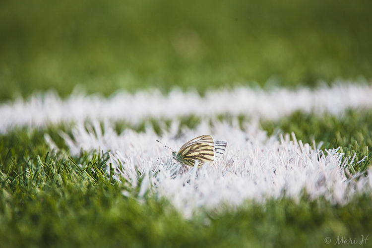 Lämpimät kelit ovat tuoneet mukanaan muutakin kuin siitepölyn. Matsin aikana muutama mehiläinen häiriköi, perhonen lensi kuvausetäisyydelle, leppäkerttu tuli syliin ja minä sain valokuvata maassa istuen. Ihan paras kuvauskorkeus, kun on kyse jalkapallosta.