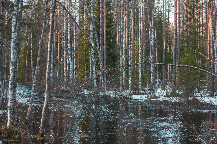 Katsoin googlemapsista mistä Arpaiseen pääsee, mutta en sen kummemmin ajatellut asiaa. Olen liikaa tottunut Turun seudulla, että sen kun ajaa luontopolkumetsien parkkipaikoille ja lähtee metsään. Se ei olekaan täällä erämaassa ihan samanlaista. Mies oli fiksumpi ja tutki missä Arpaisten parkkipaikat ovat. Lähdimme yrittämään pohjoiselle parkkipaikalle, joka sijaitsee osoitteessa Haasia-ahontie 400. Ajoimme ensin Ähtäristä Niemisvedentietä pitkästä, kunnes käännyimme Löytömäentielle ja hetken päästä Haasia-ahontielle. Haasia-ahontie oli muuten hyvä, mutta Rantatien risteyksessä se jatkui lumihankena. Siitä olisi ollut 4 kilometriä vielä Arpaisten parkkipaikalle. Käännyimme takaisin ja yritimme nähdä mihin aiemmin tien yli lentänyt teeri oli pinkonut.