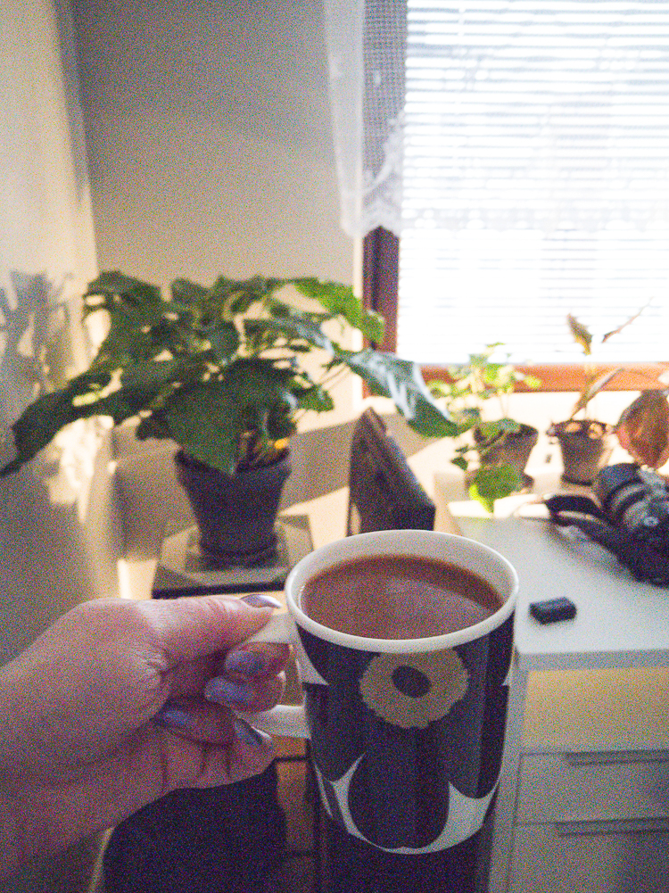 Tätä mä tarkoitan sillä, kun alkaa saada vanhasta arjesta kiinni. Kun ehtii treenata asunnon järjestelyn lisäksi ja pääsee aamulenkille viikonloppusin halutessaan. Tänä aamuna me ei haluta, koska päätettiin nukkua pitkään ilman herätyskelloa ja ulkona on niin masentavan harmaata, että suuntaamme mieluummin keskustaan kahville ja kukkakauppoihin. Tarvitsen myös uuden aluslakan kynsiin, sillä konmaritin mun kynslakat just joku ilta heittämättä mitään pois kuitenkaan. Järjestin ne siis väreittän kasoihin, totesin niitä olevan ihan helevetisti ja päätin alkaa käyttää niitä taas. Että ne joskus kuluisivat pois. Nyt mulla on siis tollainen vanha lila lakka kynsissä ilman aluslakkaa, joten ovat jo pian kulumassa pois. Jos on vinkata joku hyvä aluslakka, laita kommenttiboxiin viestiä!