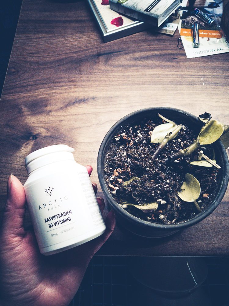 Jaksan jauhaa tästä ikuisesti, mutta kaksi kertaa d-vitamiinin puutos todettuna haluan tosissaan sanoa tämän: syökää ihmiset d-vitamiinia nämä pimeät kaudet. Te tarvitsette sitä. Ostakaa sellainen tuote, joka oikeasti imeytyy. Minä suosin oliviiöljyyn tehtyä pilleriä, mutta tällä hetkellä olemme syöneet pois *tätä Arctic Puren kasviperäistä d-vitamiinia, jonka sain jo vuosi sitten blogin kautta. Hyvin on tuntunut tämäkin kyllä imeytyvän, kun repeän kohta sisäisen aurinkoni kanssa.