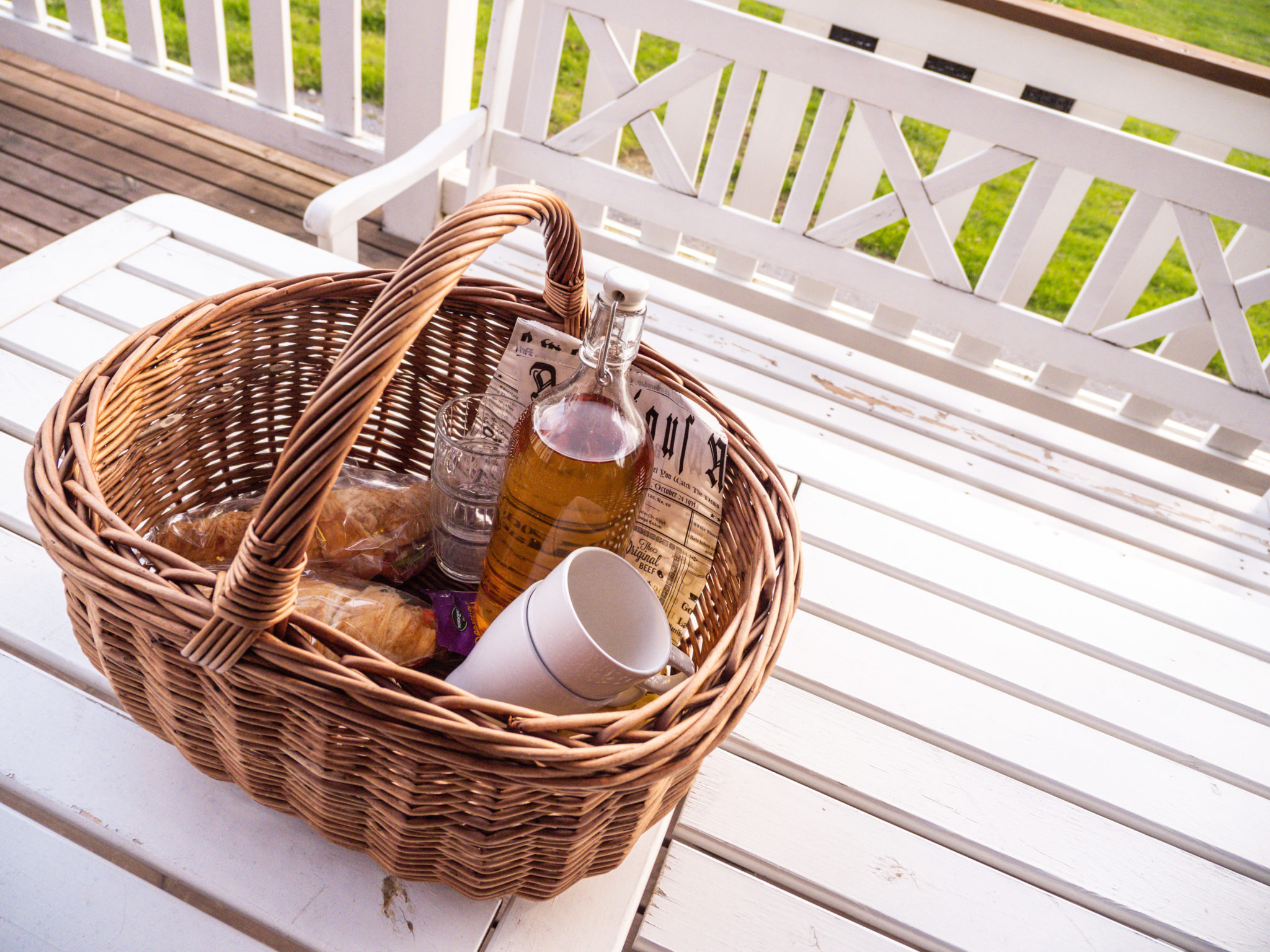 Saunomisen jälkeen maistui iltapala, joka meille oli taas tuotu valmiiksi. Otimme eväskopan mukaan ja menimme syömään etupihalle. Lättykoppa olisi myös ollut vaihtoehto, mutta emme voineet alle vuoden ikäisen vauvan kanssa alkaa saunan jälkeen paistamaan lättyjä, vaikka kuinka olisin halunnut.
