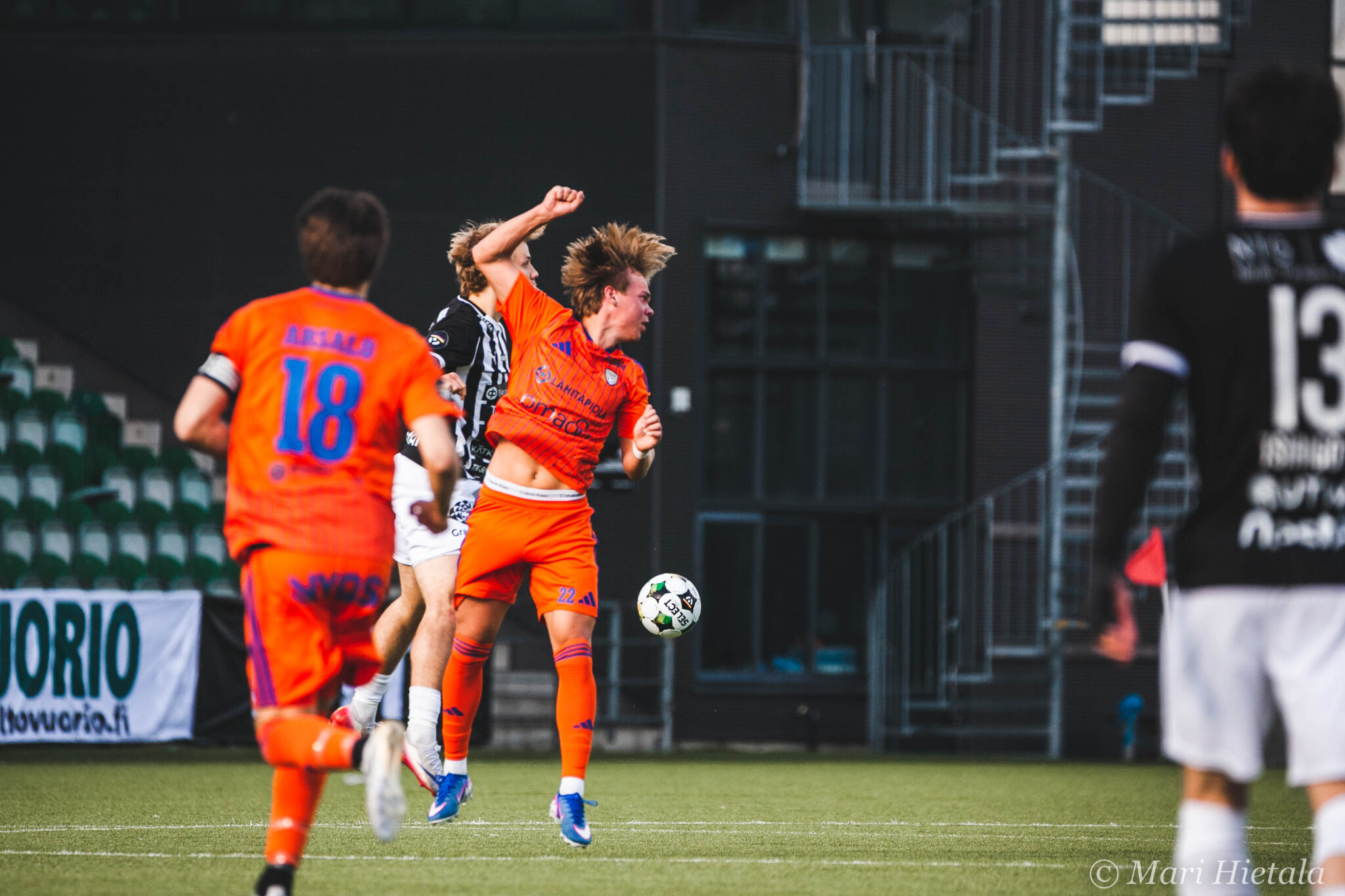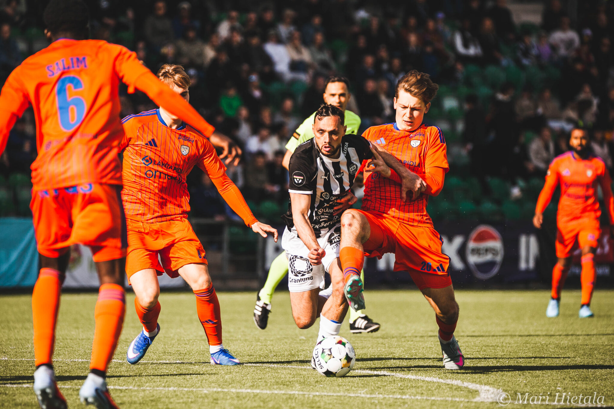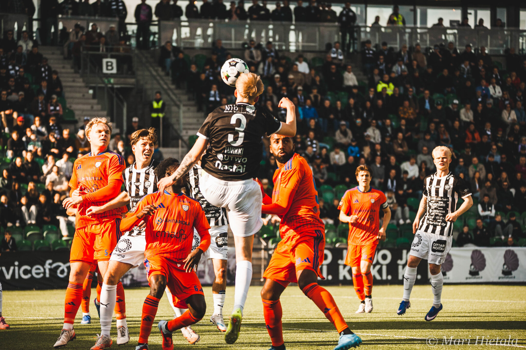 Ensimmäisellä puoliajalla häärättiin Sepsin.. eikun TP-Seinäjoen, eikun SJK:n maalilla ja yritin saada pääpallokuvia. En ole vielä koskaan osannut niitä enkä myöskään nytkään. Yllä olevan kuvan kohdalla mietin, että tämäkin on tainnut jäädä tuomarilta näkemättä kuin myös muutamat SJK:n törkeät paidassa roikkumiset. Kaikista paskin roikkuminen oli toisella puoliajalla TPS:n hyökkäyksessä keskeltä läpi. Se loppui kuin kananlento, kun TP-Seinäjoen väreissä juokseva nappasi paidasta kiinni. En tiennyt, että nykyään tämä tällainen roikkuminen on sallittua.