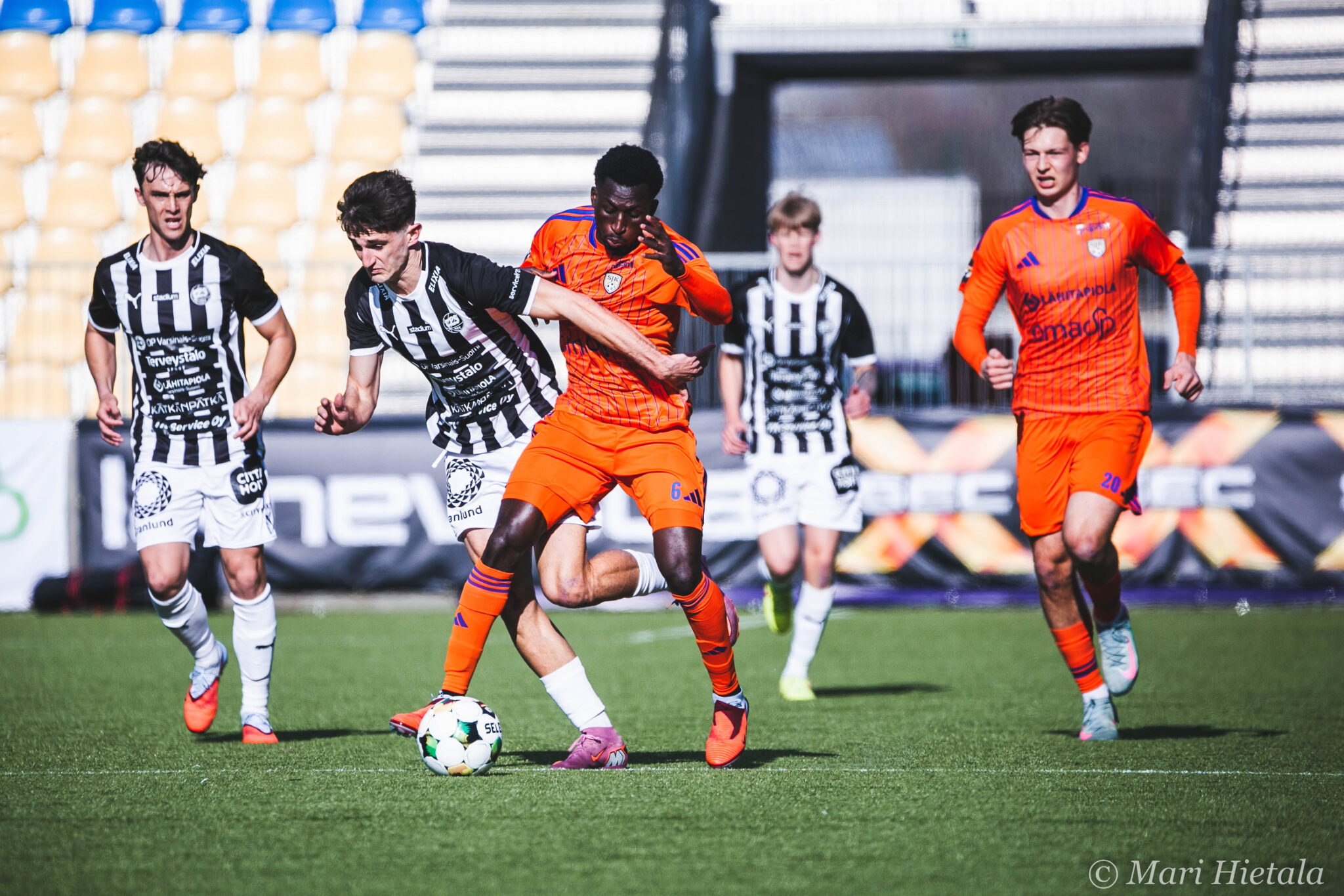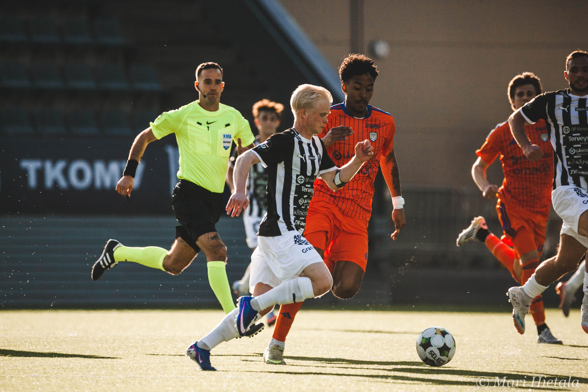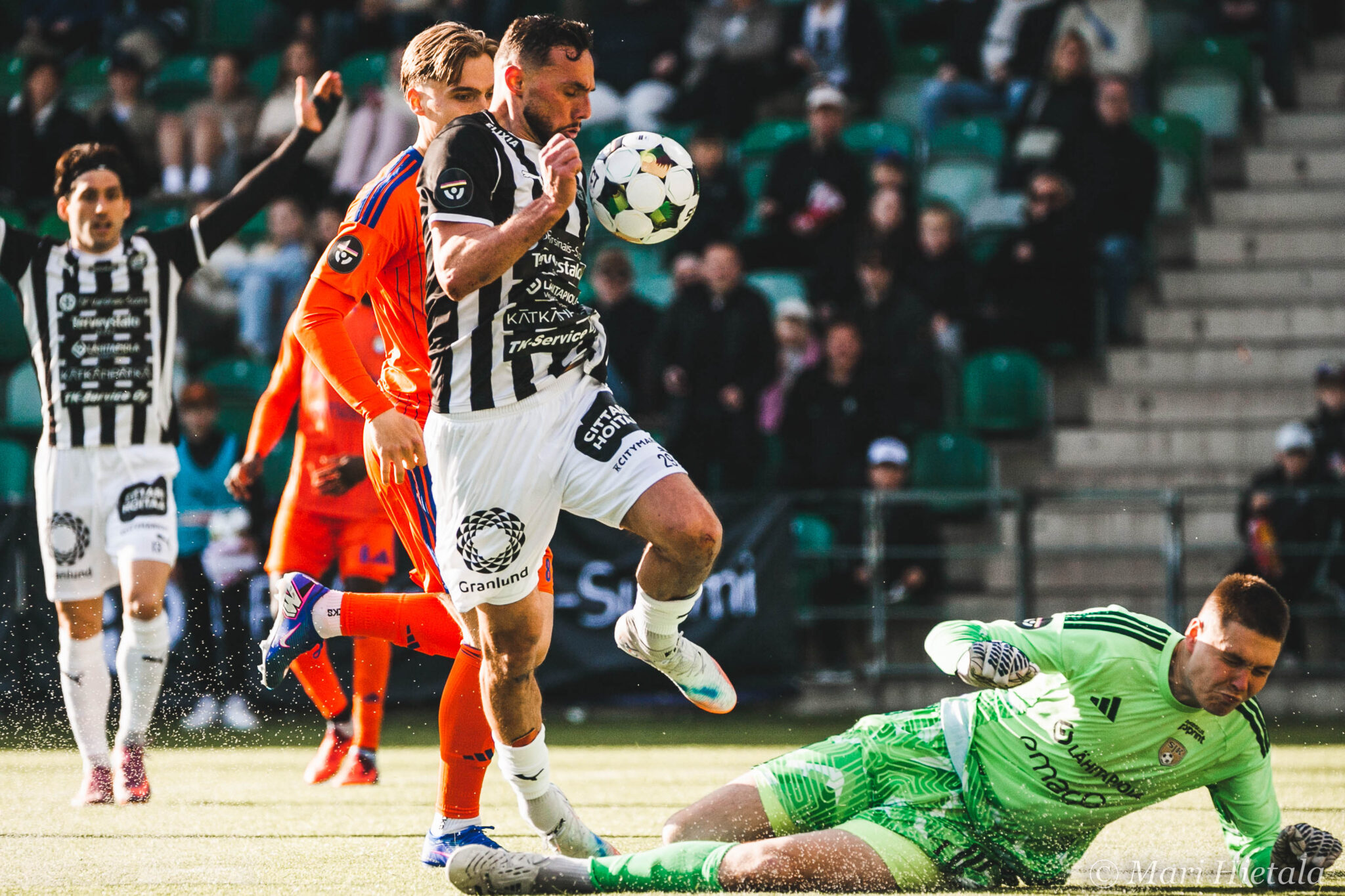 Ensimmäisellä puoliajalla häärättiin Sepsin.. eikun TP-Seinäjoen, eikun SJK:n maalilla ja yritin saada pääpallokuvia. En ole vielä koskaan osannut niitä enkä myöskään nytkään. Yllä olevan kuvan kohdalla mietin, että tämäkin on tainnut jäädä tuomarilta näkemättä kuin myös muutamat SJK:n törkeät paidassa roikkumiset. Kaikista paskin roikkuminen oli toisella puoliajalla TPS:n hyökkäyksessä keskeltä läpi. Se loppui kuin kananlento, kun TP-Seinäjoen väreissä juokseva nappasi paidasta kiinni. En tiennyt, että nykyään tämä tällainen roikkuminen on sallittua.