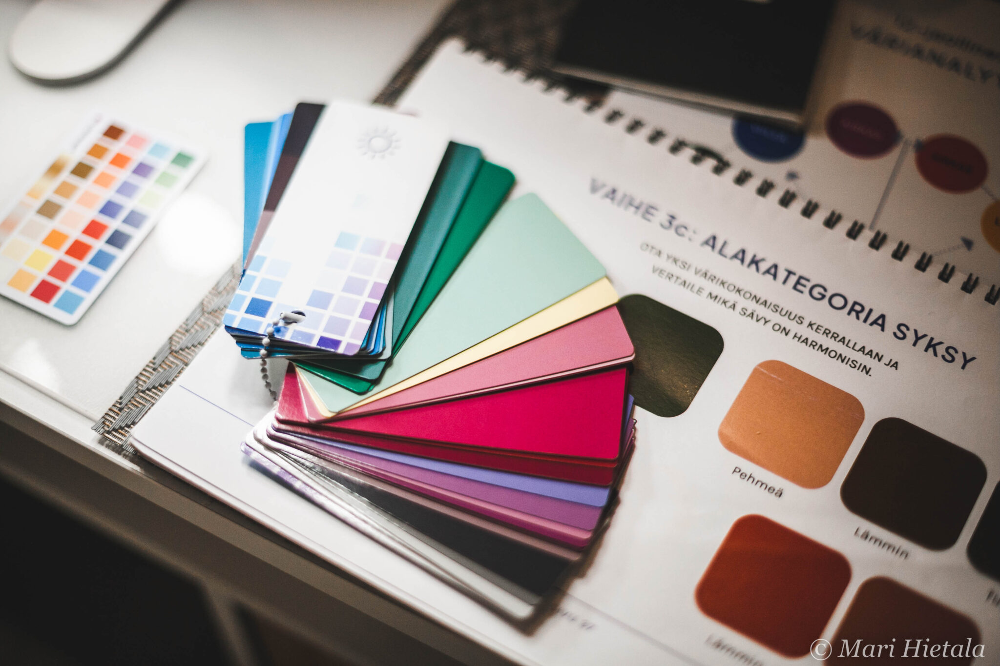 Olen pehmeä kesä. Yllä olevassa viuhkassa ovat kaikki kesän sävyt ja sellaisen sain mukaani analyysista. Sain myös pienen kortin, joka mahtuu kukkaroon, joten jatkossa pystyn aina kaupassa katsomaan onko vaate oikean sävyinen minulle. Kätevää.