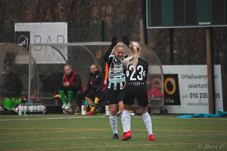 Eilen vihdoin alkoi Naistenliiga turkulaistenkin osalta. Marssimme Turun Urheilupuiston yläkentälle ajoissa ennen yhtä, joten ehti hyvin vaihtaa kuulumisia kuvaajakollegoiden kanssa pitkän talven jälkeen ja tsekata millaisia mokkapaloja buffetissa on tarjolla, mmm. Minusta kaikkien ihmisten kannattaisi käydä kahvilla futismatseissa eikä missään ostoskeskuksissa, sillä 3 euron pullakahvit itse ainakin nautiskelen paljon mieluummin kuin puolet kalliimmat. Futismatseissa sitä paitsi leipomukset ovat oikeasti äitien tekemiä ja samalla näkee myös sitä jalkapalloa.