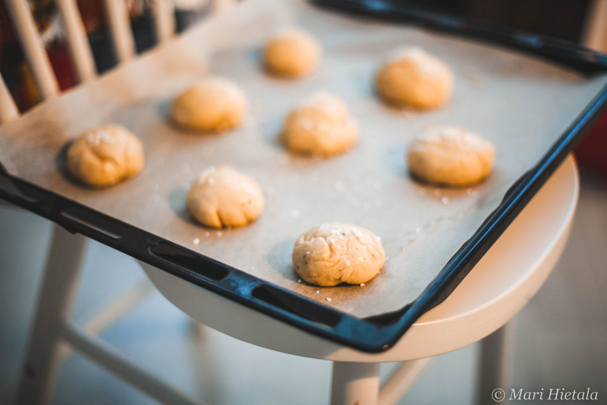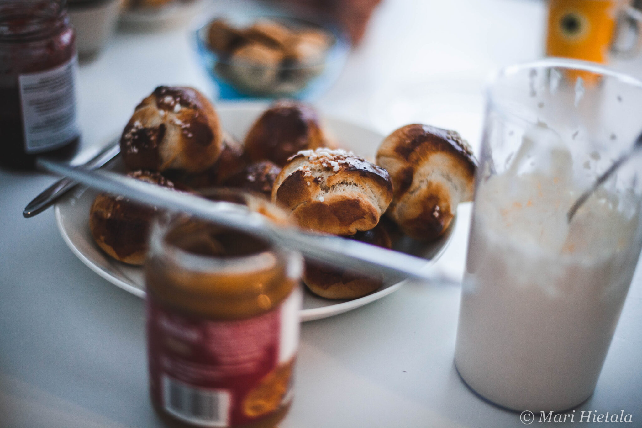 Biscoff-laskiaispullien valmistus kotikeittiössä alkaa tietysti pullataikinan tekemisellä ja pullien pyörittämisellä. Käytin itse tätä ohjetta, mutta puolitin sen, koska emme tarvitse 30 pullaa. Puolet riitti aivan hyvin.